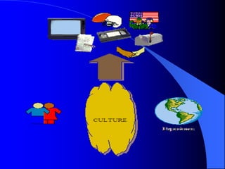 The document discusses the definitions of culture and popular culture. It defines culture as a social group's system of meaning that is symbolic, shared, learned, and ordinary. Popular culture consists of artifacts, events, and products that surround people, reflect audience beliefs and values, are commercial, and often imitative. The popularity of cultural elements is directly proportional to how much they reflect the prevailing attitudes of their time, or zeitgeist. Popular culture both reflects and shapes audience values and beliefs.