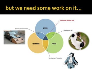 The document discusses the evolution of business education and the differences between managing large corporations versus startups. It notes that startups operate in risky environments with limited resources, so techniques used by large companies may not apply. The lean startup methodology emerged from courses on startups and books that focus on validating ideas and pivoting quickly. The document argues that the company discussed should take a lean startup approach, as it has the characteristics of a startup like uncertainty and limited resources. It proposes a LeanAKademy program to help develop and launch products using the lean methodology over two months.