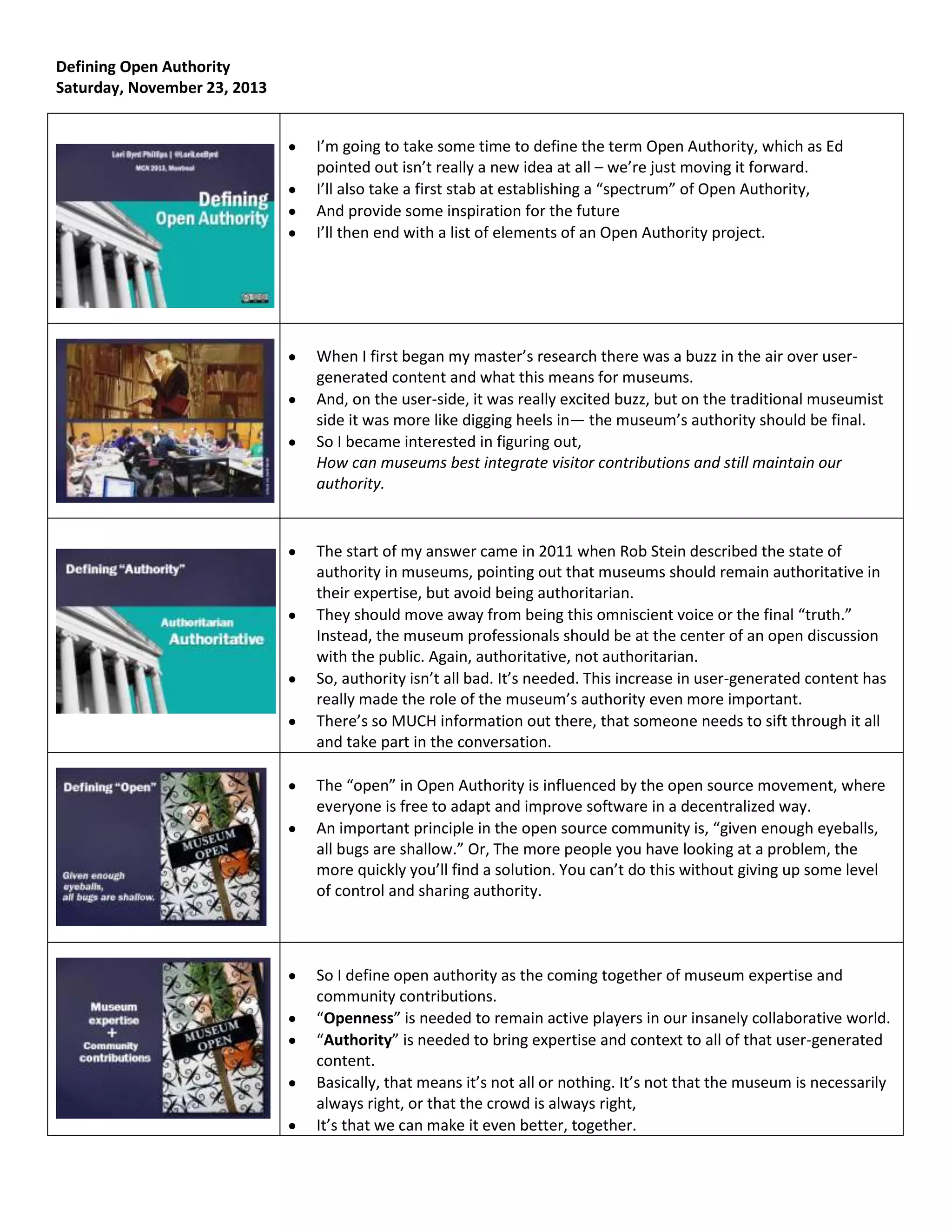 The document explores the concept of 'open authority' in museums, emphasizing the need for collaboration between museum expertise and community contributions. It proposes a spectrum of engagement models ranging from contributory to co-creative approaches, highlighting the importance of dialogue and mutual respect in the process. The Reggio Emilia educational approach is presented as a model for fostering this open authority, advocating for community involvement in exhibit design and interpretation to enhance learning experiences.