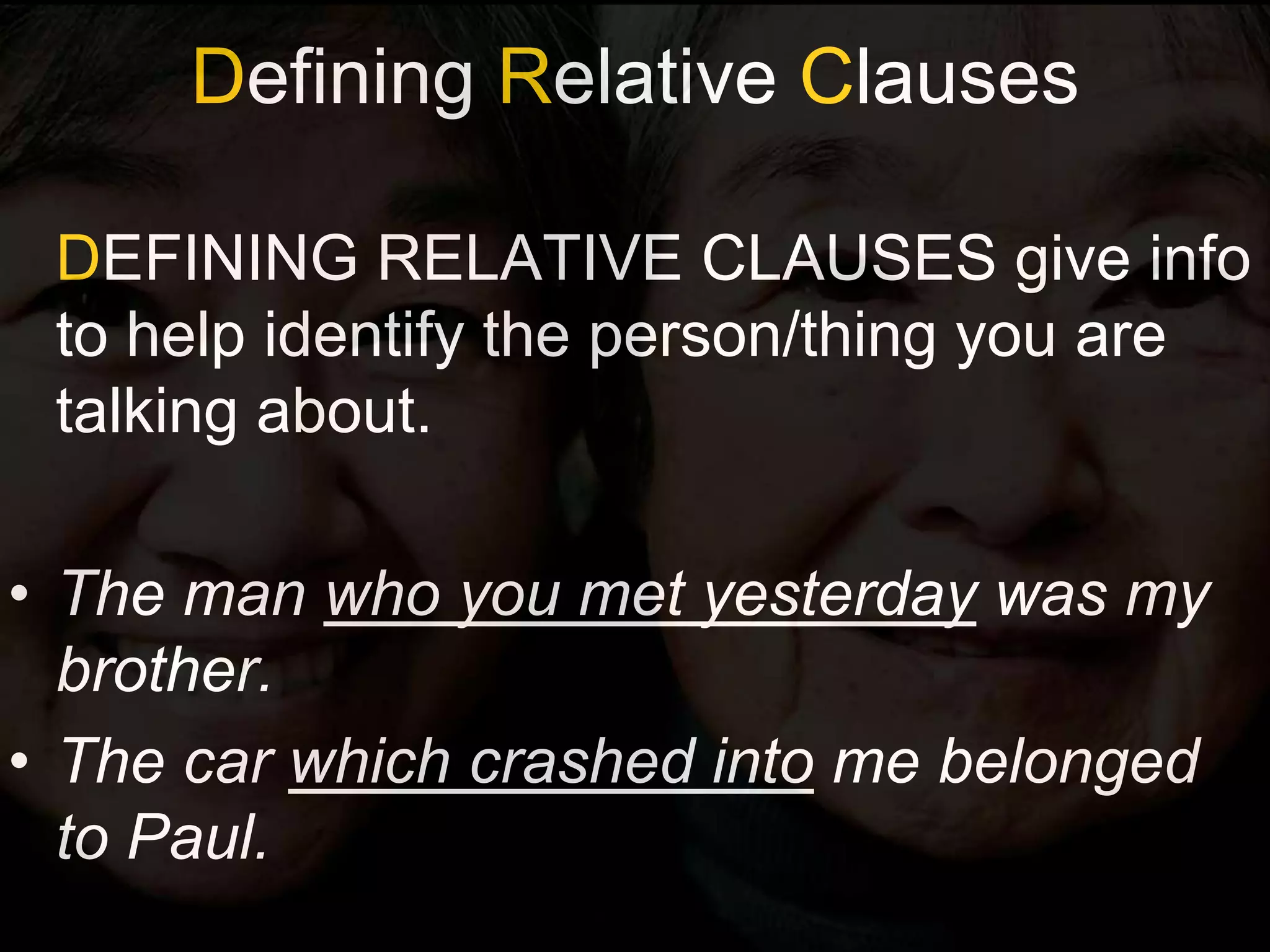 Defining relative clauses provide information to identify a person or thing and can use that, who, which, whom, whose, when, where, or why. That or who is used for people and that or which for things. The relative pronoun can be the subject or object of the verb in the relative clause. In formal English whom is used instead of who as the object. The relative pronoun can be omitted if it is the object of a preposition. Whose indicates possession. When, where, and why are used after time, place, and reason nouns, respectively. Defining relative clauses concisely identify people and things.
