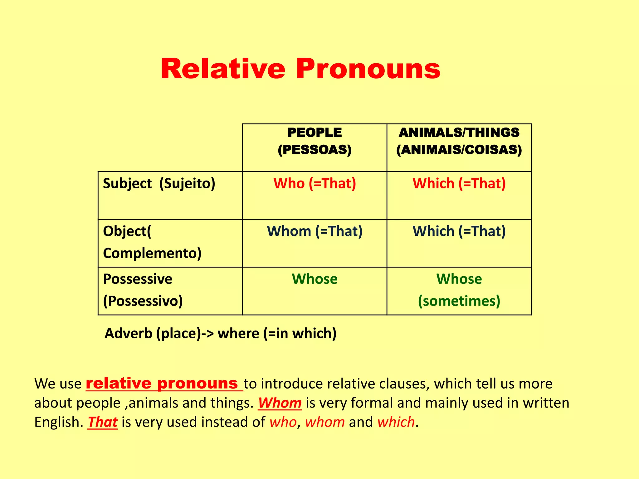 This document discusses relative clauses and relative pronouns. It provides examples of defining and non-defining relative clauses using who, whom, whose, which, that and where. Defining relative clauses identify a specific person or thing, while non-defining clauses provide extra information. Relative pronouns introduce the relative clause and the correct one to use depends on whether the antecedent is a person, animal or thing, and if it is the subject or object of the relative clause.