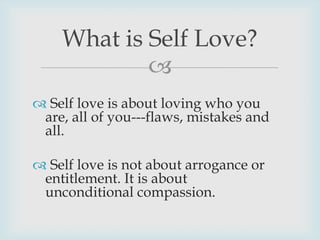 This document promotes a workshop called "Celebrate YOU!" about self-love and self-care. It defines self-love as unconditional compassion for oneself, flaws and all. Self-care is described as taking deliberate time to replenish one's mind, body and soul, not out of selfishness but to refresh one's spirit. The workshop teaches that self-love and self-care are important not just because you deserve them, but because you need them to enrich your life. It is a daily practice that the workshop, held on March 29th, will help people learn.