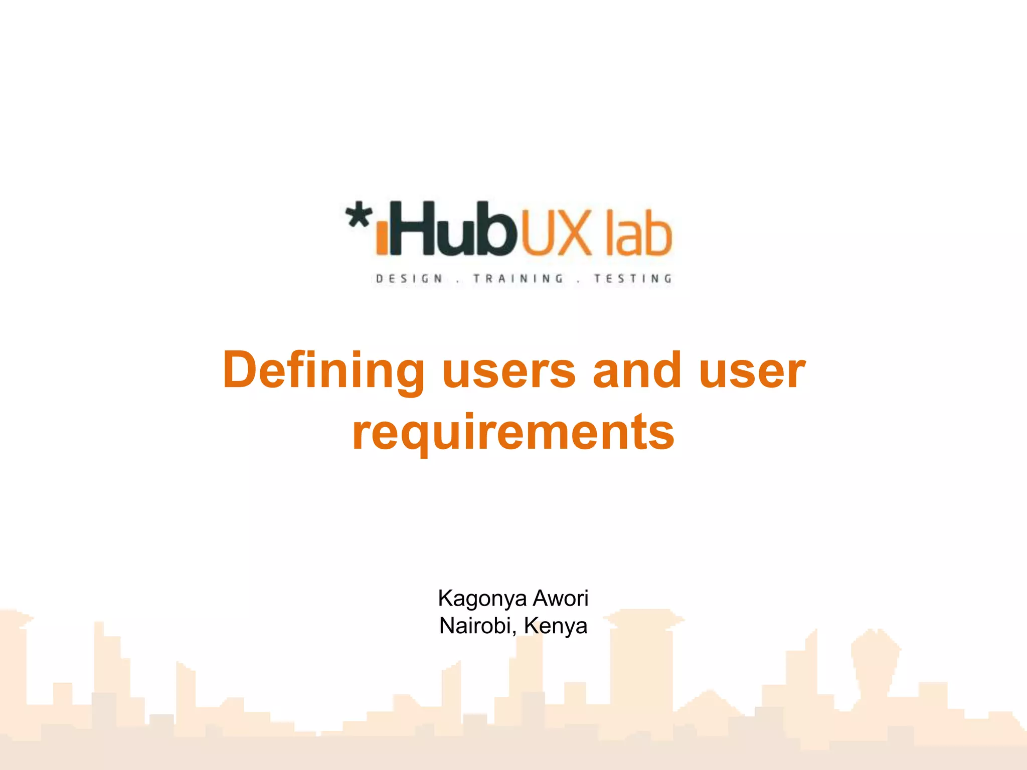 This document defines users and the process for conducting user experience research. It discusses identifying a problem area, exploring questions about the problem, choosing which questions to solve, defining the types of users, creating a "hunt statement" to investigate a specific user, and conducting user research through field research, desk research and studying industry competitors. The facilitator is introduced as a UX researcher based in Nairobi, Kenya with a Masters from Carnegie Mellon University.