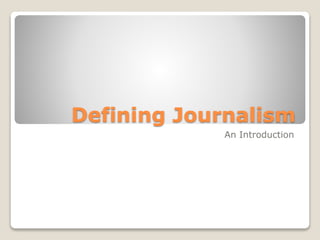 This document discusses the definition of journalism and the challenges involved in defining it. As technology has advanced, the lines between journalism, gossip, and entertainment have blurred. At the high school level, journalism is best approached as reporting and writing news to present to an audience. The document also discusses 10 potential roles for a student publication and analyzes how to prioritize them, with news reporting and interpretation seen as high priorities. It notes the importance of discussion to set priorities and the collaborative nature of journalism. Legal rights of student journalists under the First Amendment are also touched on.