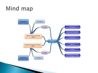 This document compares definite clause grammars (DCGs) and augmented transition networks (ATNs) for language analysis. DCGs extend context-free grammars by allowing non-terminals to be terms rather than just atoms, and allow procedure calls in rule right-hand sides. DCGs are more powerful, concise, efficient and flexible than ATNs, while also being well-suited for theoretical linguistic work.