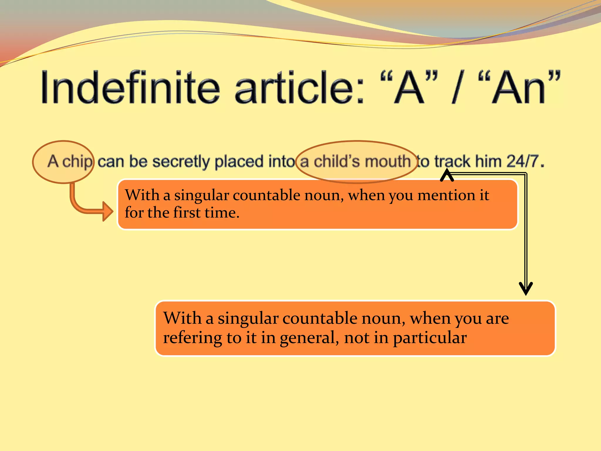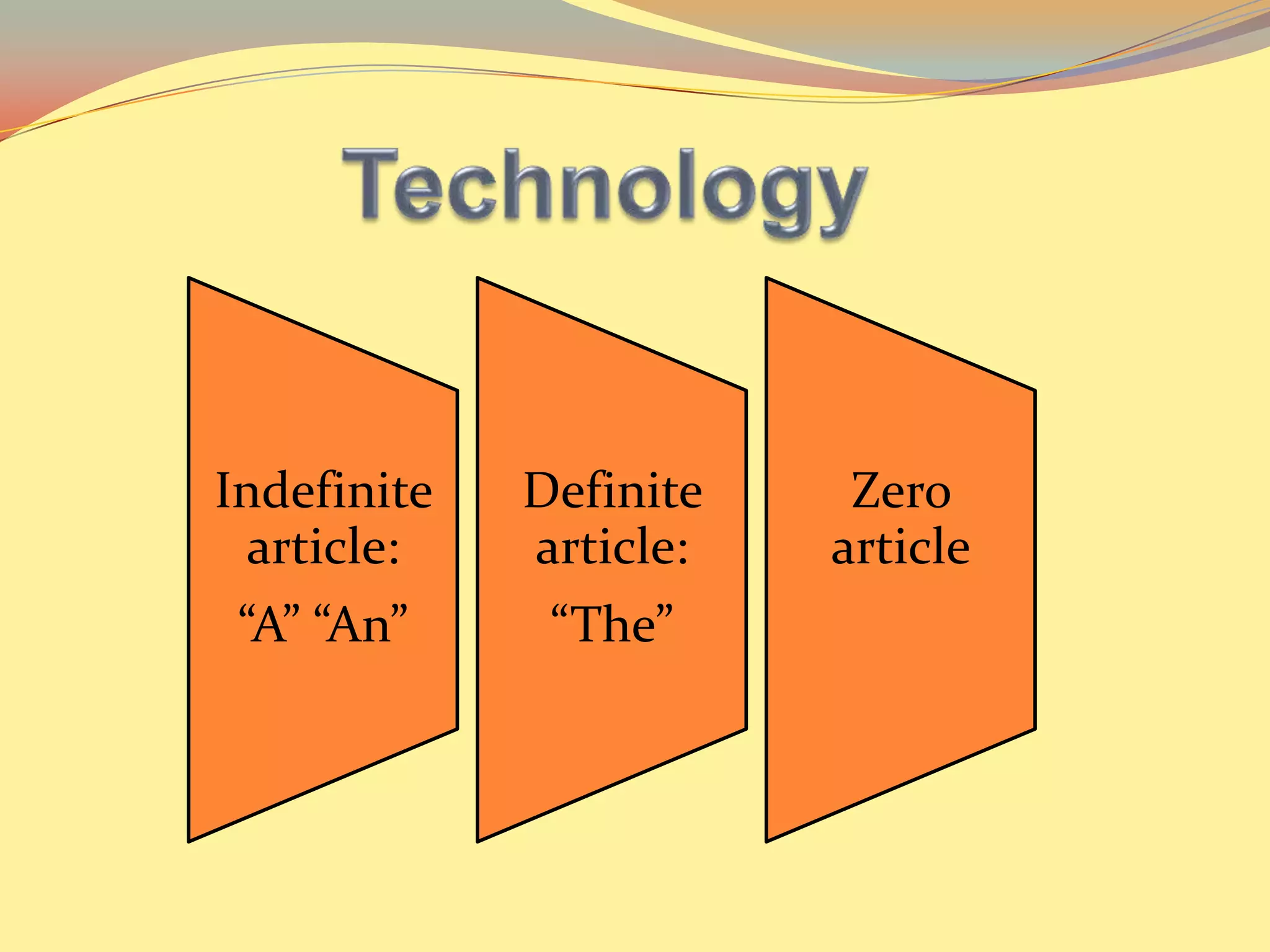 The document discusses the uses of indefinite articles, definite articles, and the zero article in English. The indefinite article "a" or "an" is used with singular countable nouns when mentioned for the first time or referred to in general. The definite article "the" is used with singular countable nouns when referred to in particular or highlighting importance, or when referring to a unique item. The zero article is used with plural countable nouns or uncountable nouns.