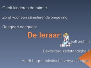 Een veilige leeromgevingcreëren Modelgedrag vertonen Betrekken bij ontwikkeling leerlingen Liefdevolle autoriteit uitstralen Theoretische en methodische inzichten hebben.