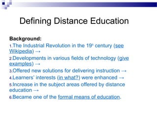 Distance education is defined as a method of education where the learner and teacher are separated by space and time. It involves structured learning materials and two-way communication technologies to facilitate the educational process between remote locations. Historically, distance education emerged from developments in technology in the 19th century that offered new solutions for delivering instruction to learners' interests from afar. Early technologies like audio cassettes were used to transmit information between remote teachers and students, while modern technologies like video conferencing now enable live video and audio interaction over the internet to support distance learning.