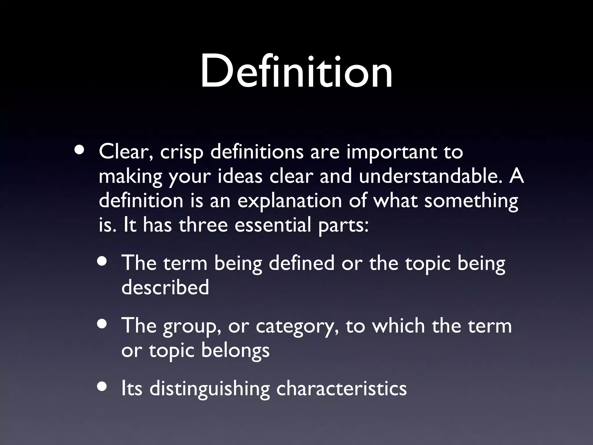 A definition explains what a term or topic is by including three essential parts: the term being defined, the category it belongs to, and its distinguishing characteristics. The thesis statement of a definition paragraph should explain the purpose of the definition, rather than just identifying the term. When defining unfamiliar topics, it is helpful to compare them to familiar topics and explain how they differ from similar topics. Writing a definition essay should include a thesis stating the importance of understanding the defined term, devote a paragraph to each distinguishing characteristic, and provide sufficient details to make the topic understandable.