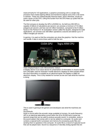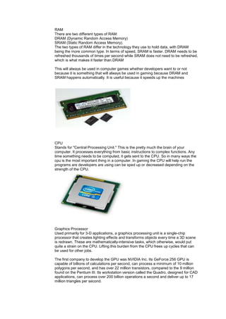 There are two main types of RAM, DRAM and SRAM, that differ in how they hold data, with DRAM being more common. The CPU processes instructions and computations, and its strength affects gaming performance. The GPU handles graphically intensive tasks like rendering 3D scenes to reduce strain on the CPU. It was first developed by NVIDIA and is used in gaming to display graphics. Storage media like hard drives are used to store games and files on computers and consoles.