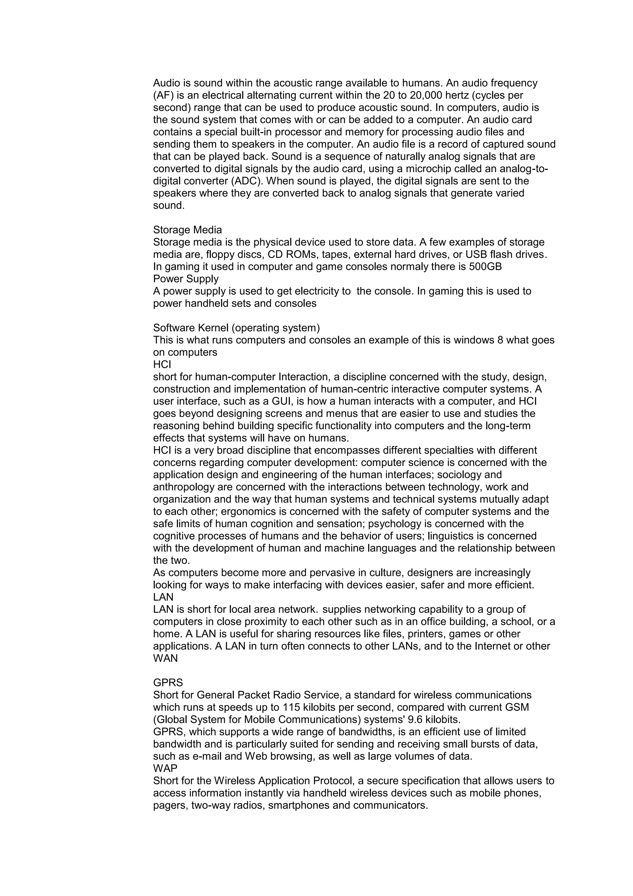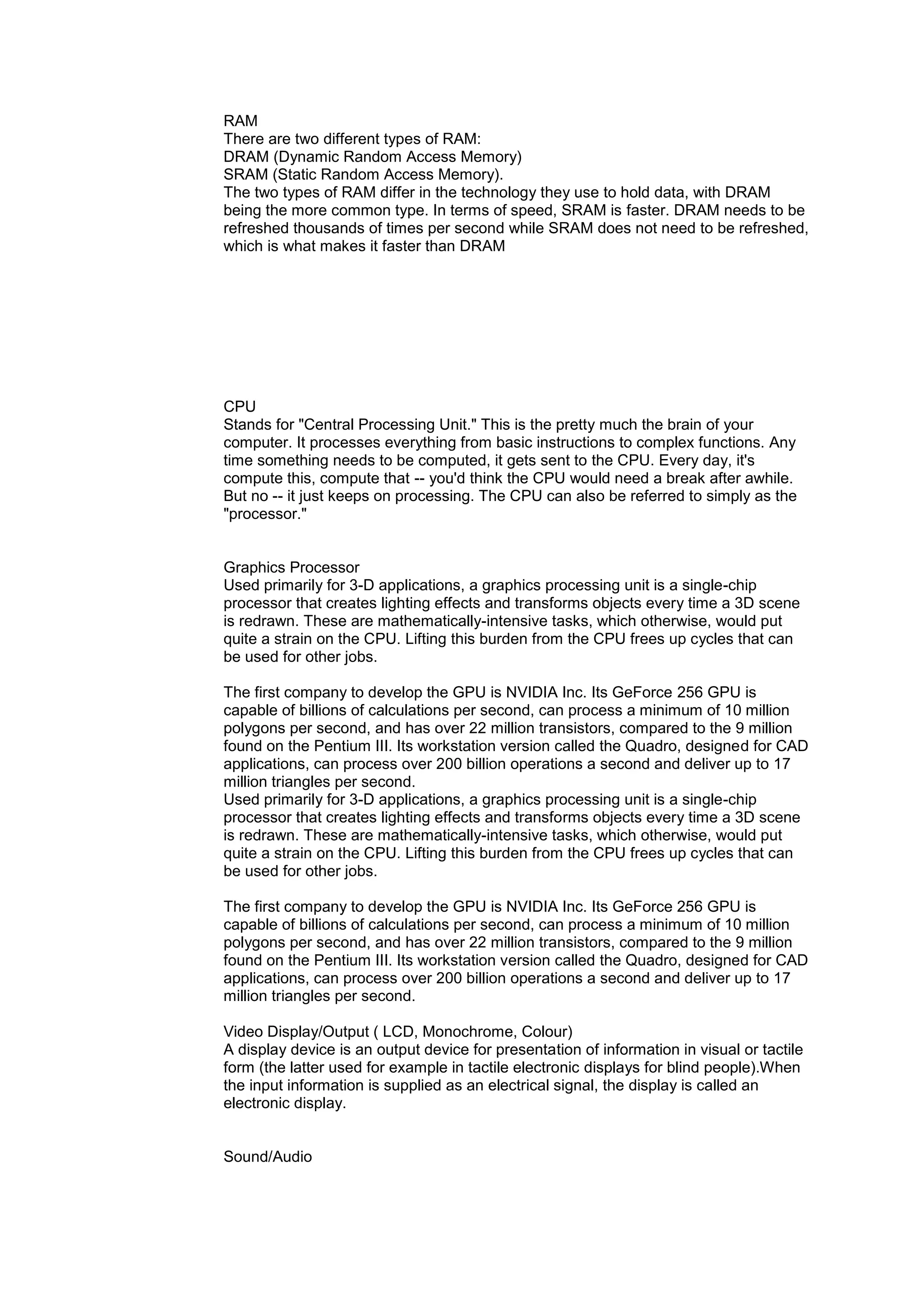 The document discusses several components and technologies related to computers and gaming: