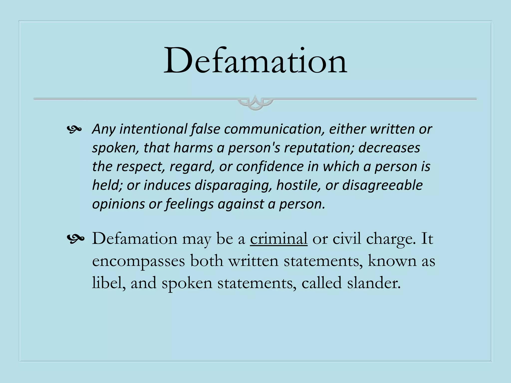 Defamation is any false communication that harms a person's reputation through disparaging statements. It can be a criminal or civil offense and includes both libel, which is written defamation such as in publications, and slander, which is spoken defamation. Libel is considered more serious legally than slander due to the potential of wider distribution of written statements. Slander involves telling untruths about someone to others and can be grounds for a civil lawsuit, with damages typically limited to actual losses unless malicious intent can be proven.
