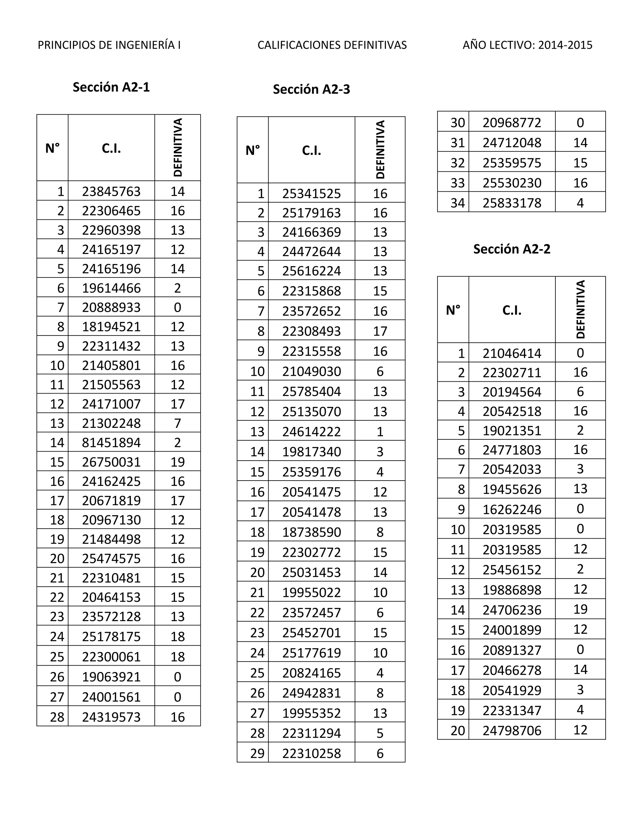 Adjunto Calificaciones Definitivas de la Asignatura Principios de Ingeniería I Secciones A2-1, A2-2 y A2-3 del año lectivo 2014-2015. Prof. Mario Yovera
