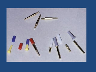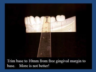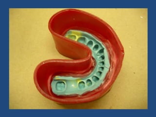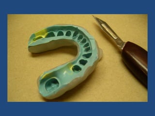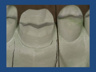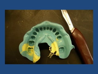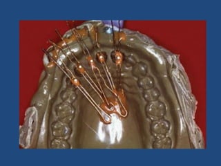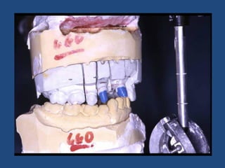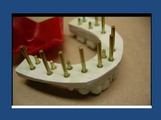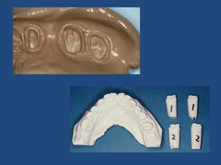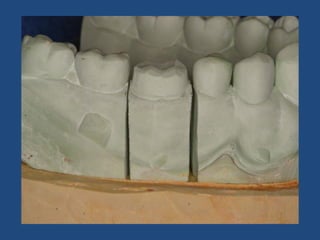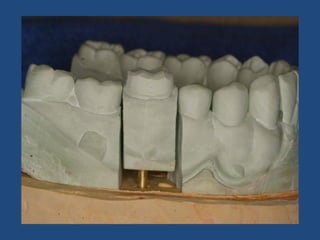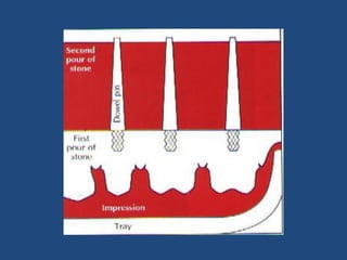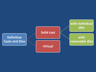 The document discusses definitive casts and dies used in fixed prosthodontics. It defines a definitive cast as a positive replica of the prepared teeth and surrounding structures. A die is the positive reproduction of the prepared tooth. There are several techniques for creating dies that can be removed from the definitive cast, including the dowel pin technique, Pindex system, and Di-Lock tray technique. The document also discusses requirements and various materials used for dies, such as gypsum, resin, electroplated metals, and ceramics. Virtual definitive casts and dies created using CAD/CAM systems are also introduced.