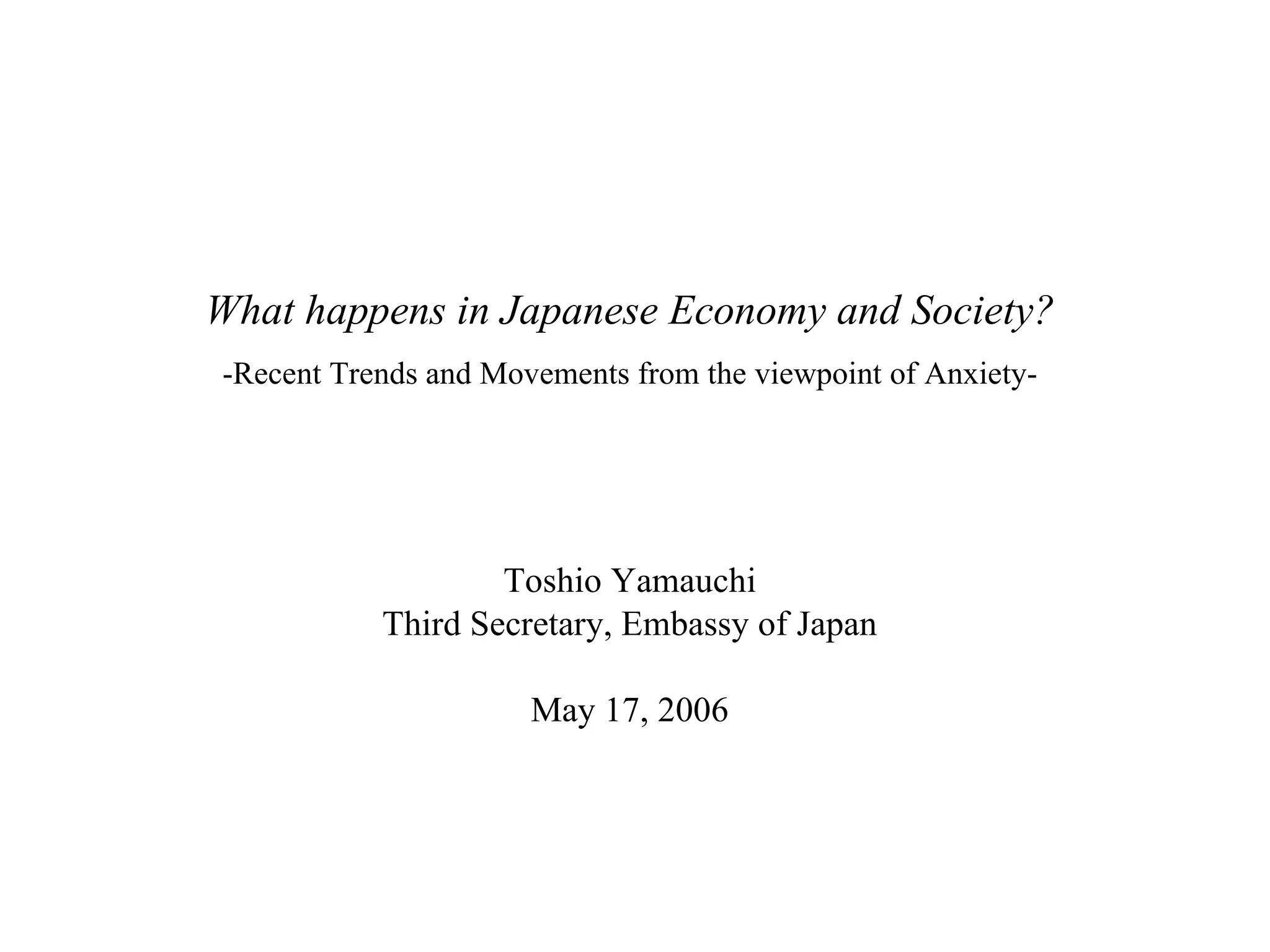 The document discusses recent economic trends and anxieties in Japan from the perspective of a Japanese government official. It describes Prime Minister Koizumi's economic reforms in the early 2000s that aimed to reduce government spending and promote structural reform. However, these reforms failed to cure Japan's persistent deflation and economic stagnation. Younger generations in Japan feel anxious about their future financial security due to factors like declining wages, cuts to pensions, and concerns over supporting the aging population. Under these conditions of anxiety and uncertainty, Japanese consumers and businesses have become increasingly conservative with spending and hiring.