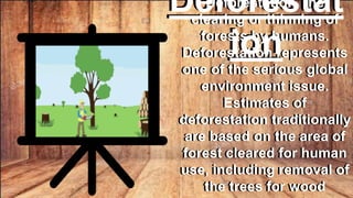 The document discusses deforestation, defining it as the human-induced clearing of forests and highlighting its serious global environmental impact. Causes include illegal logging, urbanization, mining, forest fires, and the production of paper, while effects encompass climate change, soil erosion, floods, wildlife extinction, and food insecurity. To combat deforestation, it suggests using recycled products, reducing firewood use, planting more trees, and minimizing paper consumption.