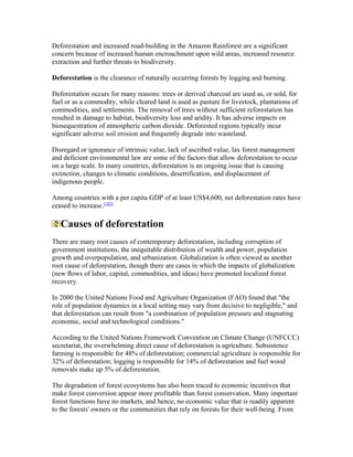 Deforestation is the removal of forests through logging and burning trees. It occurs for various reasons like using trees for fuel, making charcoal, clearing land for agriculture, livestock grazing or settlements. Deforestation damages habitats, reduces biodiversity, and adversely impacts the carbon and water cycles. It contributes to climate change, soil erosion, desertification and displacement of indigenous people. The main direct causes of deforestation are agriculture (subsistence and commercial), logging, and fuel wood removals. Deforestation reduces environmental services provided by forests and degrades ecosystems.
