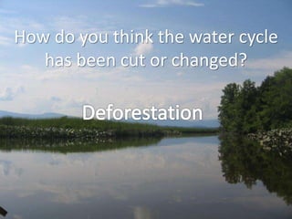 The document discusses the impact of deforestation on the water cycle, particularly emphasizing the significance of transpiration in maintaining streamflow. It outlines methods to combat deforestation, such as raising awareness, improving land use, and promoting recycling. The conclusion calls for policy makers and individuals to take responsibility and implement strategies to address deforestation.