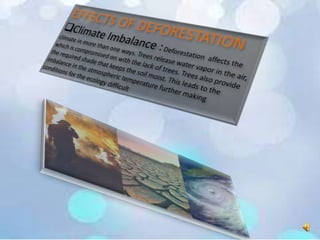 This document discusses deforestation, its causes and effects. The major causes of deforestation mentioned are agricultural activities, logging, urbanization, mining and forest fires. Deforestation leads to negative environmental impacts such as climate imbalance, increased global warming, soil erosion and floods. It also causes wildlife extinction as animals lose their habitats. The best solution provided to reduce deforestation is enacting laws to curb the felling of trees and banning clear cutting of forests.
