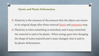 This document discusses deformation of solids under stress. It defines elastic deformation as temporary deformation that returns to the original shape when stress is removed. Plastic deformation is permanent and the material retains its deformed shape. Elastic deformation involves small amounts of strain and follows Hooke's law, while plastic deformation has larger strains and does not follow Hooke's law. The document also defines stress, strain, elastic modulus, Hooke's law, and the Heckel equation as they relate to deformation of solids.