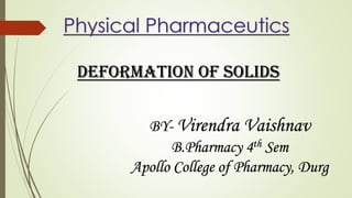 The document discusses the deformation of solids, including definitions of stress, strain, and the processes of elastic and plastic deformation. It describes various types of stress (tensile, compressive, and shear) as well as the concept of creep in viscoelastic materials. The document also highlights the relationship between stress and strain through the elastic modulus and the conditions under which these deformations occur.