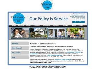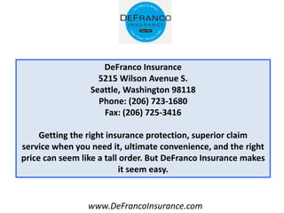 DeFranco Insurance is an independent insurance agency located in Seattle, Washington that offers a wide range of insurance products for individuals, families, and businesses. They represent many top-rated insurance companies and aim to provide customers with flexibility, economy, and superior protection. Services include auto, home, and business insurance, as well as specialty products. Customers can obtain quotes online or by calling the agency.