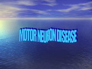 This document discusses degenerative diseases and focuses on motor neuron disease (MND). It defines MND as the progressive degeneration of motor neurons in the spinal cord, brain stem, and motor cortex. The document covers the pathology, epidemiology, genetics, clinical features, investigations, management, and prognosis of MND. It describes different variants of MND including amyotrophic lateral sclerosis, primary lateral sclerosis, progressive muscular atrophy, and bulbar onset disease. No cure currently exists for MND, though riluzole has been shown to modestly prolong survival.