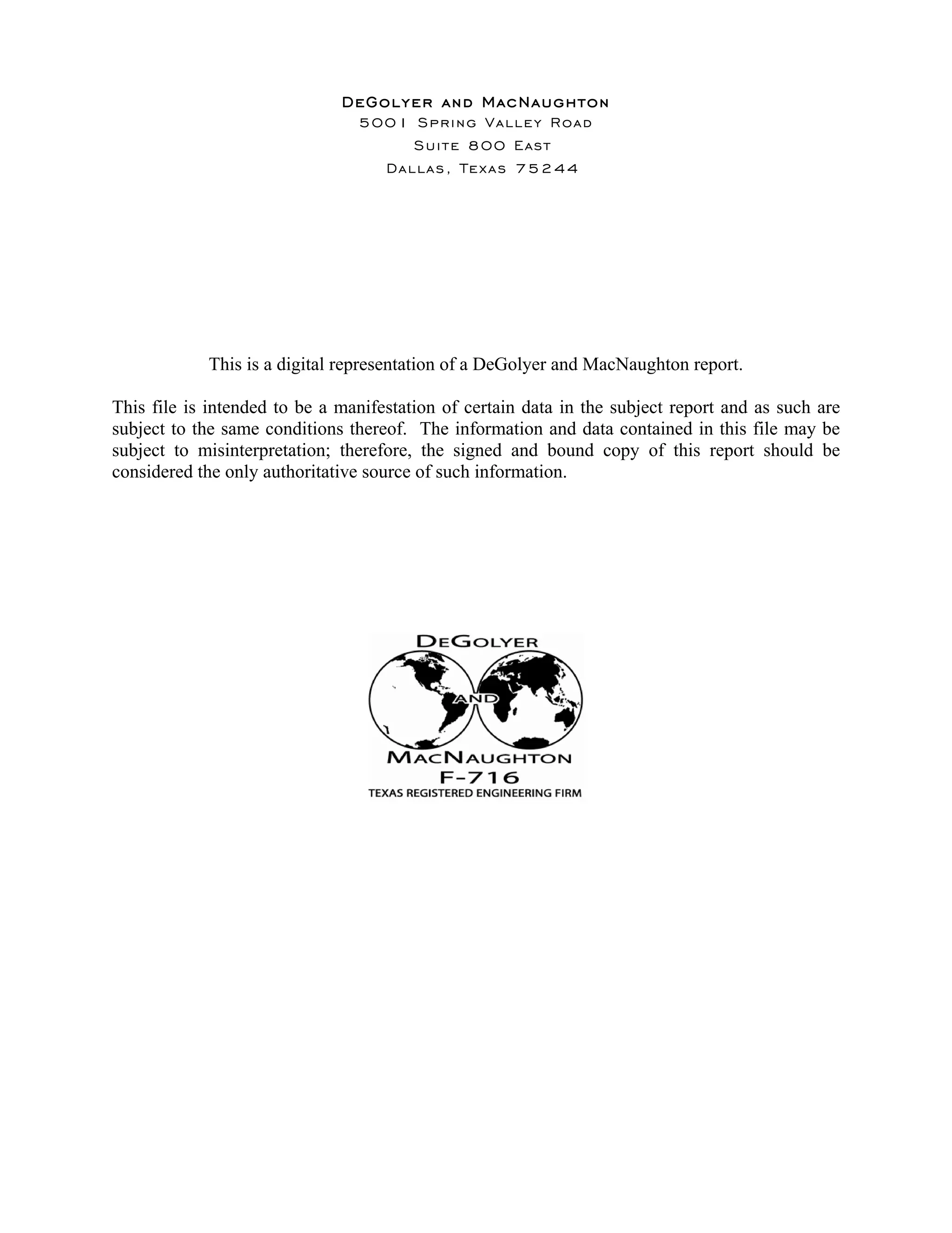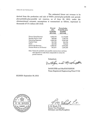 This report summarizes estimates of proved, probable, and possible crude oil reserves and the value of proved-plus-probable and proved-plus-probable-plus-possible reserves in the Tubarão Martelo field in Brazil as of June 30, 2013. DeGolyer and MacNaughton estimated reserves and future revenue based on information provided by OGX Petróleo e Gás Participações S.A., which owns a 100% working interest in the field. Estimates are presented on a gross and net basis and comply with industry standards for reserves classifications of proved, probable, and possible. Values are expressed in terms of future gross and net revenue, discounted at various rates.