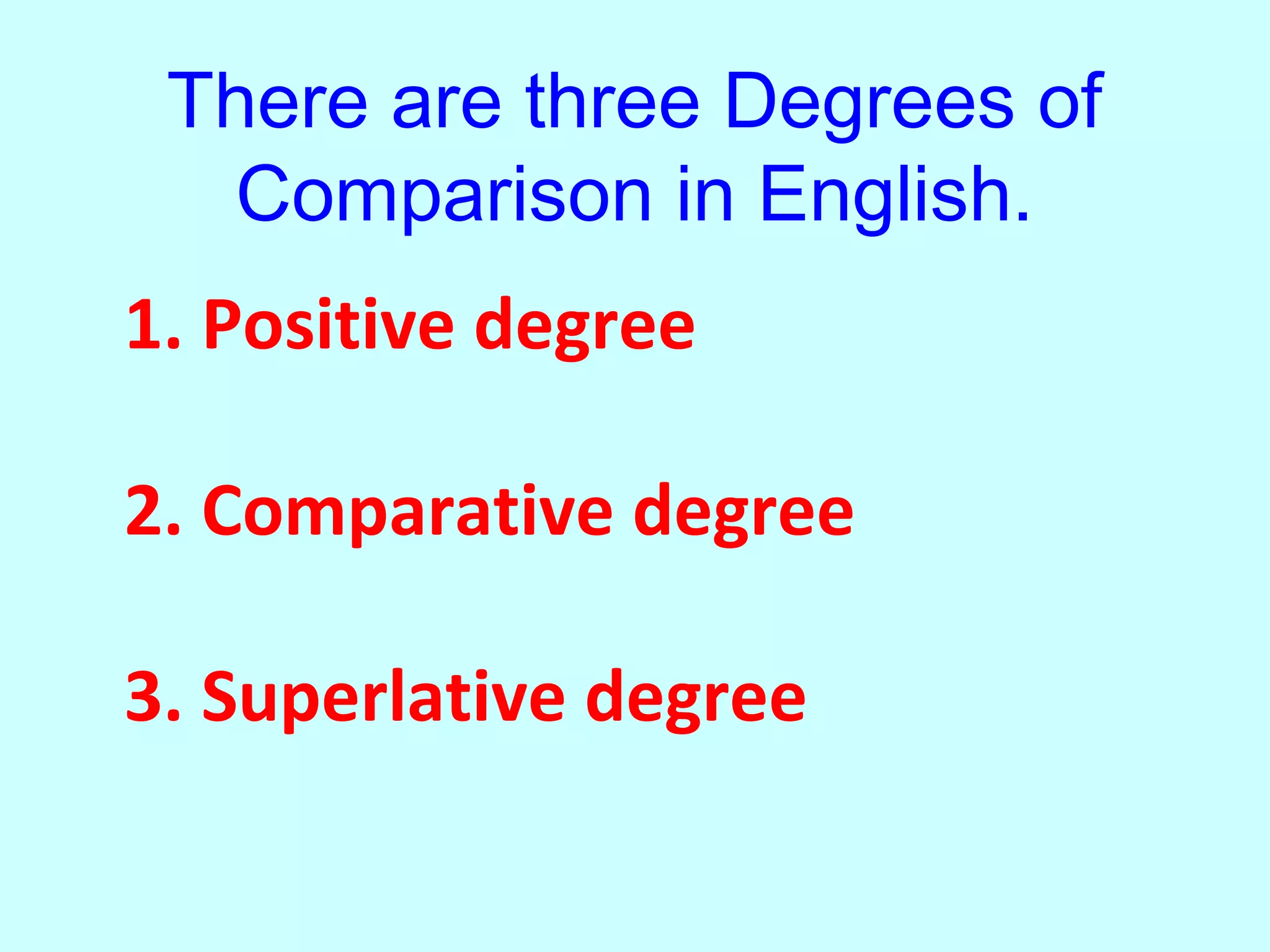There are three degrees of comparison in English: positive, comparative, and superlative. The positive degree is used to describe one person or thing. The comparative degree is used to compare two people or things. The superlative degree is used to compare more than two people or things and expresses the highest level. Adjectives are made comparative and superlative through different methods depending on their syllable length, ending, and whether they are regular or irregular.