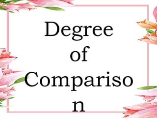 This document discusses the three degrees of comparison in English: positive, comparative, and superlative. The positive degree is used to describe one person or thing. The comparative degree is used to compare two people or things. The superlative degree compares more than two people or things and indicates the highest level. It provides examples and rules for forming the comparative and superlative degrees for adjectives of different syllable lengths, including irregular forms.