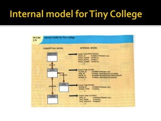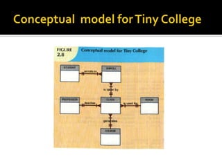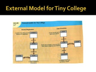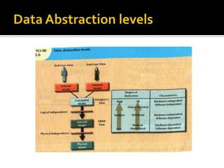 The document discusses three levels of data abstraction defined by ANSI - the external, conceptual, and internal levels. The external level represents the end user's view, the conceptual level provides a global view of the data independent of software and hardware, and the internal level maps the conceptual model to a specific DBMS in a software-dependent way. These levels of abstraction provide organization and flexibility in data modeling.