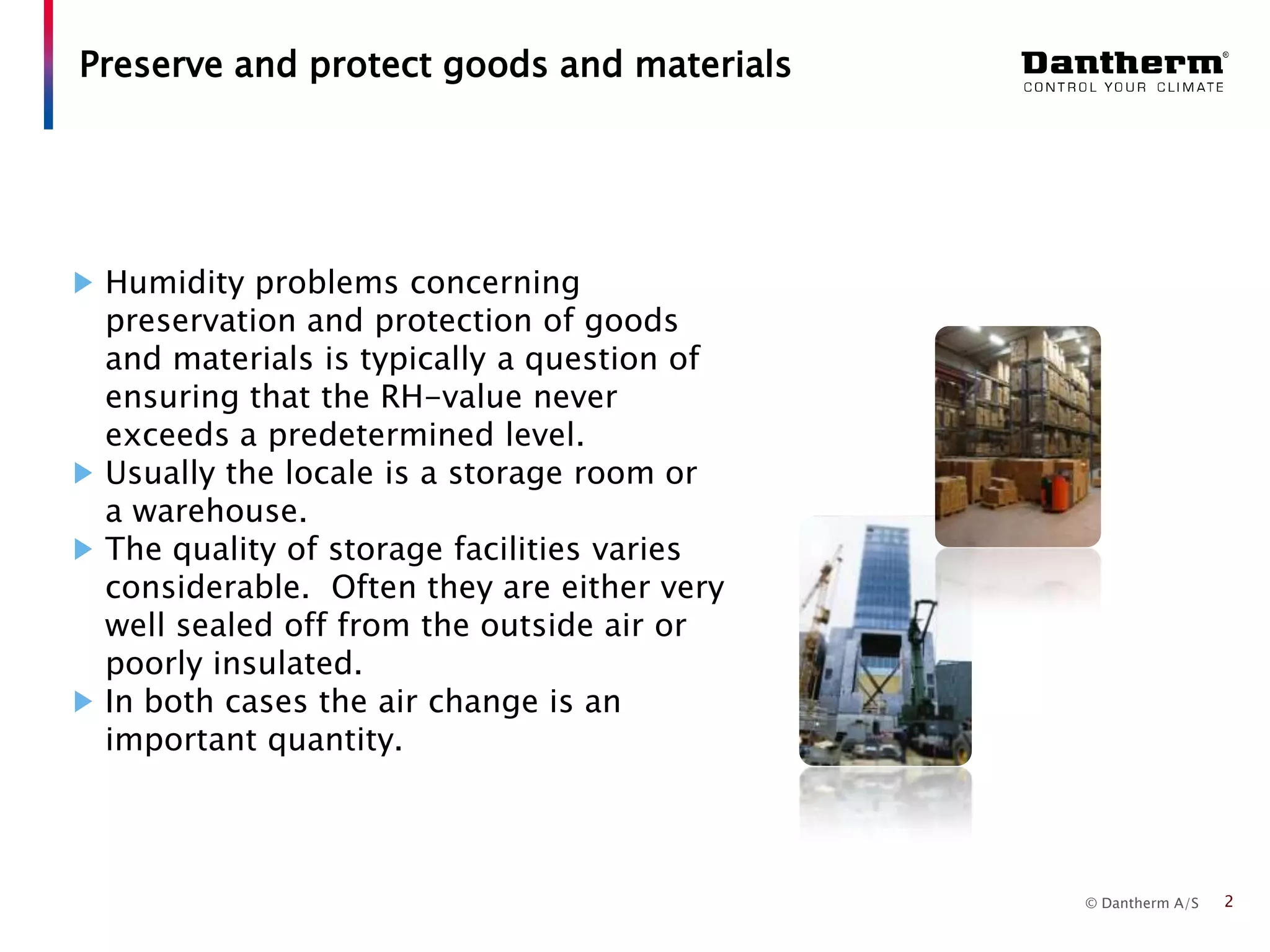 This document discusses where and why dehumidification is needed. It explains that dehumidification is often required to preserve goods and materials in storage rooms and warehouses by keeping relative humidity (RH) below a certain level. Proper insulation and air changes are important factors to control humidity. Dehumidification is also necessary to protect equipment and structures at water works from condensation that occurs when the dew point is higher than surface temperatures of pipes and other metal surfaces. High humidity can cause corrosion, mold growth, and other issues. The document provides a table showing maximum recommended RH levels at different temperatures to avoid condensation when water is at 7°C.