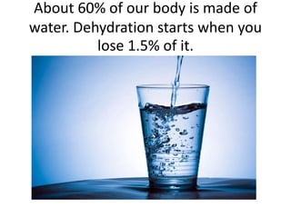 Dehydration occurs when the body loses more than 1.5% of its water content. Common causes of dehydration include sweating, breathing, exercise, aging, altitude, stress, diarrhea, and alcohol consumption. Symptoms of mild dehydration include thirst, reduced appetite, flushing, dark urine, dry mouth, fatigue, headaches, chills, and dizziness. It is important to drink 6-8 cups of water per day to avoid dehydration and its negative health effects.