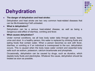 Dehydration and heat stroke are life-threatening heat-related illnesses that can occur if the body loses too much water and salt through sweating. Dehydration is caused by not drinking enough fluids, while heat stroke happens when the body is unable to cool itself during extreme heat exposure. Symptoms of dehydration include thirst, fatigue, and dry skin, while heat stroke symptoms include confusion, hot dry skin, and high body temperature. Both conditions require rehydration with fluids or intravenous fluids in severe cases. Drinking plenty of water and avoiding long periods in the heat can help prevent dehydration and heat stroke.