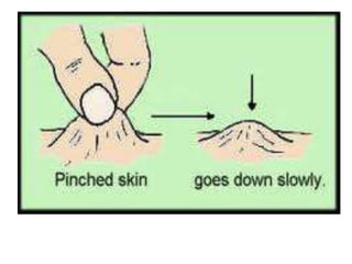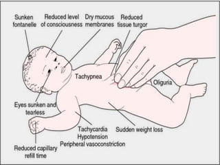 This document discusses dehydration in pediatrics. It defines dehydration and explains its pathophysiology and types based on severity and fluid/electrolyte loss. Causes of dehydration include diarrhea, vomiting, excessive sweating, diabetes and burns. Diagnosis involves blood and urine tests to check electrolyte levels. Signs and symptoms range from mild thirst to severe complications depending on the percentage of fluid loss. Treatment involves oral or IV fluid replacement depending on severity. Nursing care focuses on monitoring fluid intake and output, providing skin care and educating families on prevention.