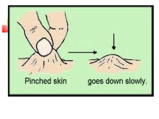 Dehydration is defined as an excessive loss of body fluid and electrolytes where output exceeds input. It can be caused by diarrhea, vomiting, excessive sweating, burns, or blood loss. Dehydration is classified as mild, moderate, or severe based on the total fluid loss as a percentage of body weight. Clinical signs and symptoms vary with the severity of dehydration and can include thirst, dry skin, decreased urine output, drowsiness, and in severe cases, extreme thirst, sunken eyes, and loss of consciousness. Treatment involves oral rehydration for mild to moderate cases and IV fluids for severe dehydration, with the type and rate of fluids dependent on degree of dehydration and electrolyte