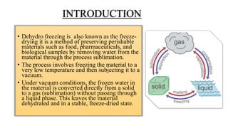 This document discusses dehydro freezing or freeze drying, which is a method of preserving perishable materials like food and pharmaceuticals. It involves freezing the material and then applying a vacuum so that the frozen water sublimates from solid to gas without passing through the liquid phase. Freeze dryers are used to remove water through sublimation in an industrial setting. They have components like a vacuum chamber, vacuum pump, condenser, temperature and pressure sensors, heating source and control system to carefully monitor and control the freeze drying process. Various types of freeze dryers exist for different applications. Freeze drying is useful for preserving foods like fruits, vegetables, coffee, eggs and meats as it retains nutrients, taste and texture better than other preservation