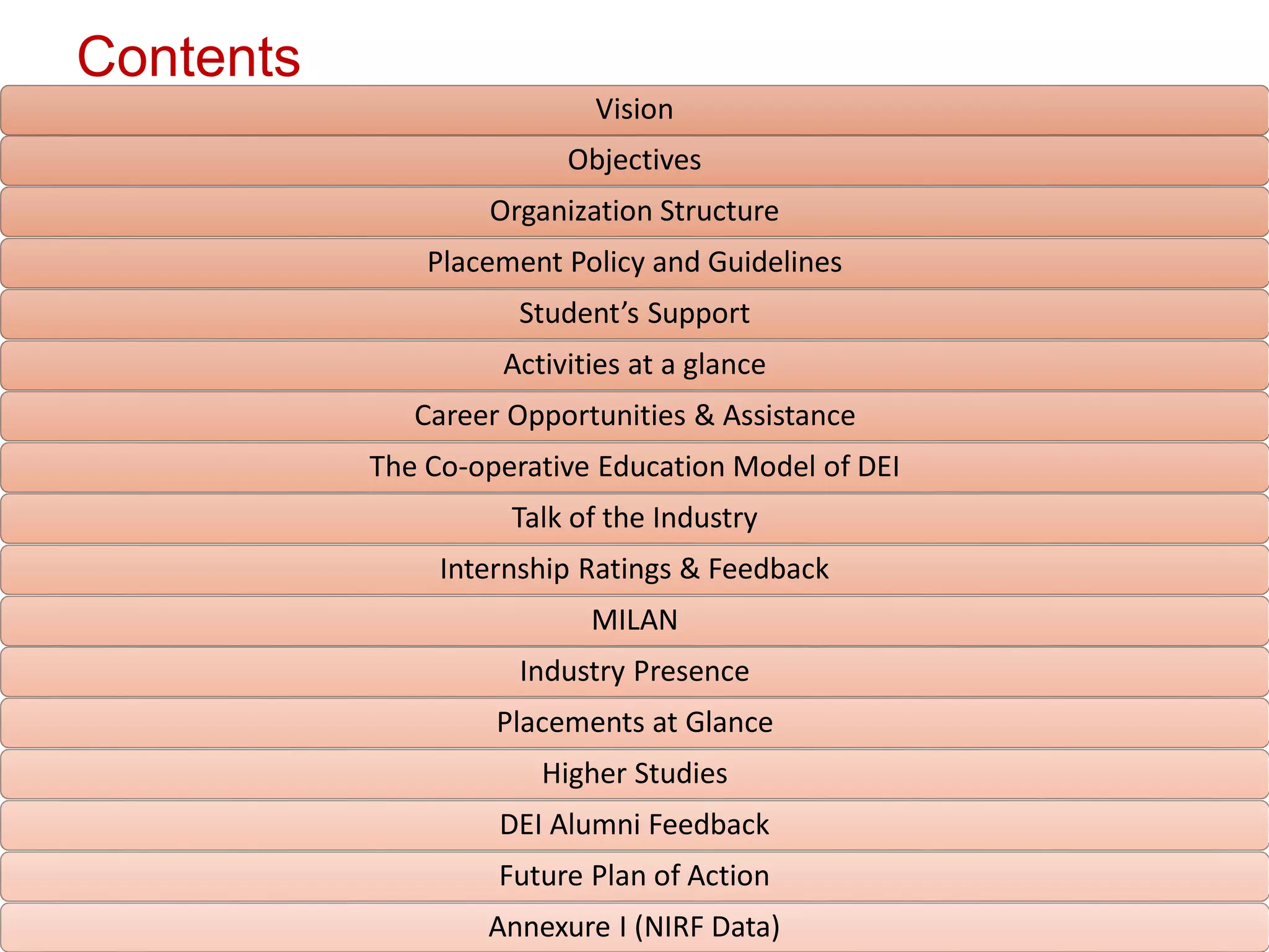 The document outlines the vision, objectives, and organizational structure of a training and placement program, emphasizing the preparation of students for various career opportunities through continuous mentoring and skill development. It details the structured placement policy, including multiple phases of training, internships, feedback mechanisms, and student support activities aimed at enhancing employability. The document also includes statistical data on placements and alumni feedback from recent years, along with future plans for strengthening industry partnerships.