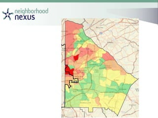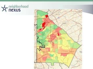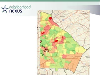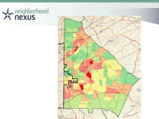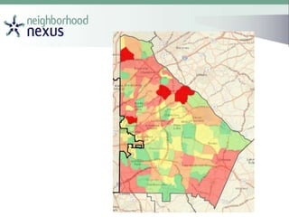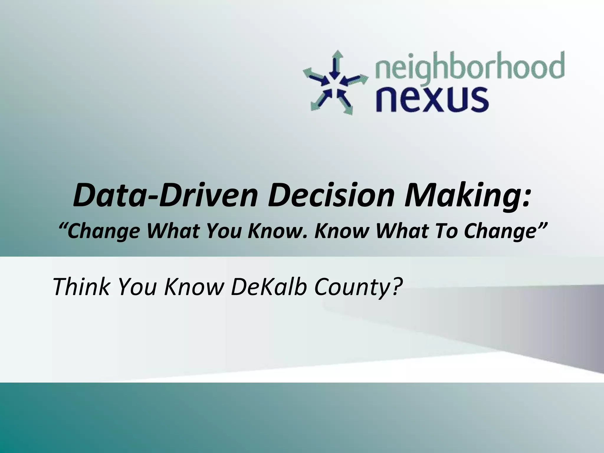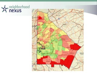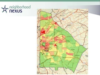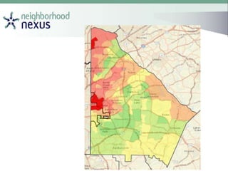 This document discusses key demographic data and trends in DeKalb County, Georgia. It provides statistics on population growth, density, age, income levels, education levels, poverty rates, health insurance coverage, employment, and population forecasts for different areas within the county. The data shows, for example, that the area south of Lithonia added almost 10,000 new residents between 2000-2010, while the area north of Tucker has the highest population density at around 13,000 people per square mile.