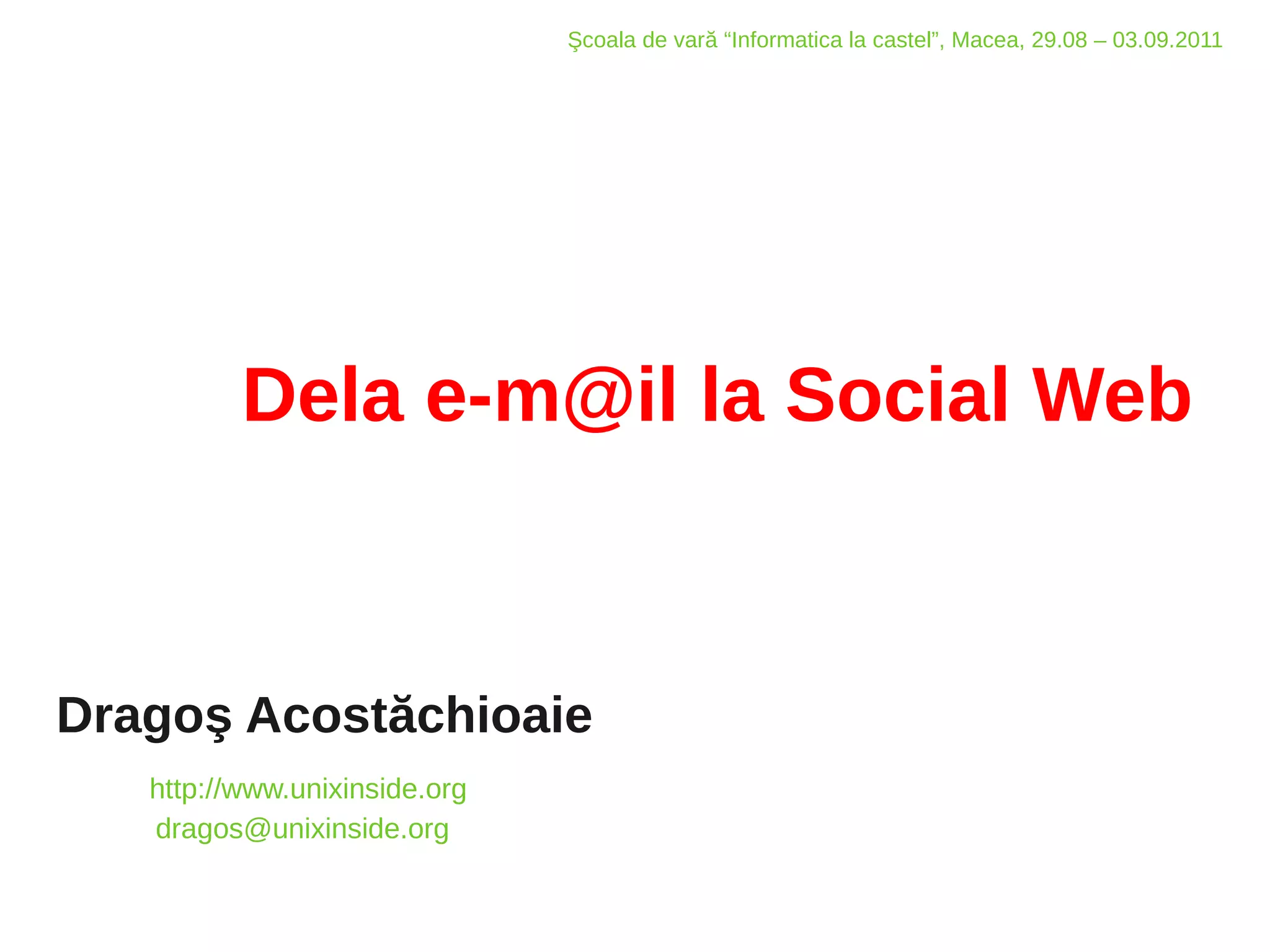Școala de vară "Informatica la castel" din Macea, desfășurată între 29 august și 3 septembrie 2011, abordează conceptul de web social, definit ca o rețea de relații interumane online. Documentul prezintă istoria și evoluția web-ului social, de la primele aplicații precum e-mailul și BBS-urile la platformele sociale contemporane precum Facebook și Twitter. De asemenea, se analizează viitorul web-ului social, cu accent pe standardizarea identității utilizatorilor, gestionarea privatității și dezvoltarea unei arhitecturi sociale deschise.