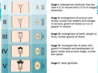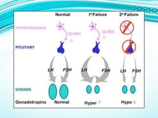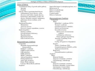This document provides information on evaluating and treating delayed puberty. It defines delayed puberty and discusses the main causes, which include constitutional delay of puberty, hypogonadotropic hypogonadism, and hypergonadotropic hypogonadism. Evaluation involves assessing medical history, physical exam including Tanner staging, lab tests of hormone levels, bone age, and imaging if needed. Treatment depends on the underlying cause, and may include observation, sex hormone therapy, or treating any underlying medical conditions.