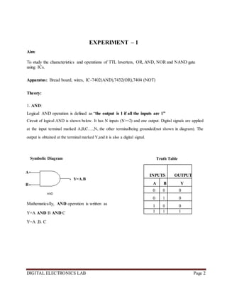 The document outlines a series of digital electronics laboratory experiments at Shri Rawatpura Sarkar Institute of Technology, focusing on various logic gates such as TTL inverters, NAND and NOR gates, and their applications in designing arithmetic circuits like adders and subtractors. Additionally, it demonstrates the verification of De Morgan's theorems and explores universal gates capable of implementing any Boolean function. Each experiment includes objectives, apparatus required, theoretical background, and results confirming the truth tables.