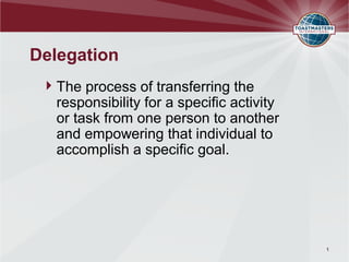 The document discusses delegation and empowering employees. It defines delegation as transferring responsibility for a task from one person to another to accomplish a goal. It identifies common barriers to delegation such as lack of confidence and control. It then outlines a five step process for effective delegation: prioritizing tasks, matching tasks to employee skills and abilities, assigning responsibility, empowering employees, and establishing accountability. The benefits of delegation include a more engaged workforce, increased productivity, quality and innovation.
