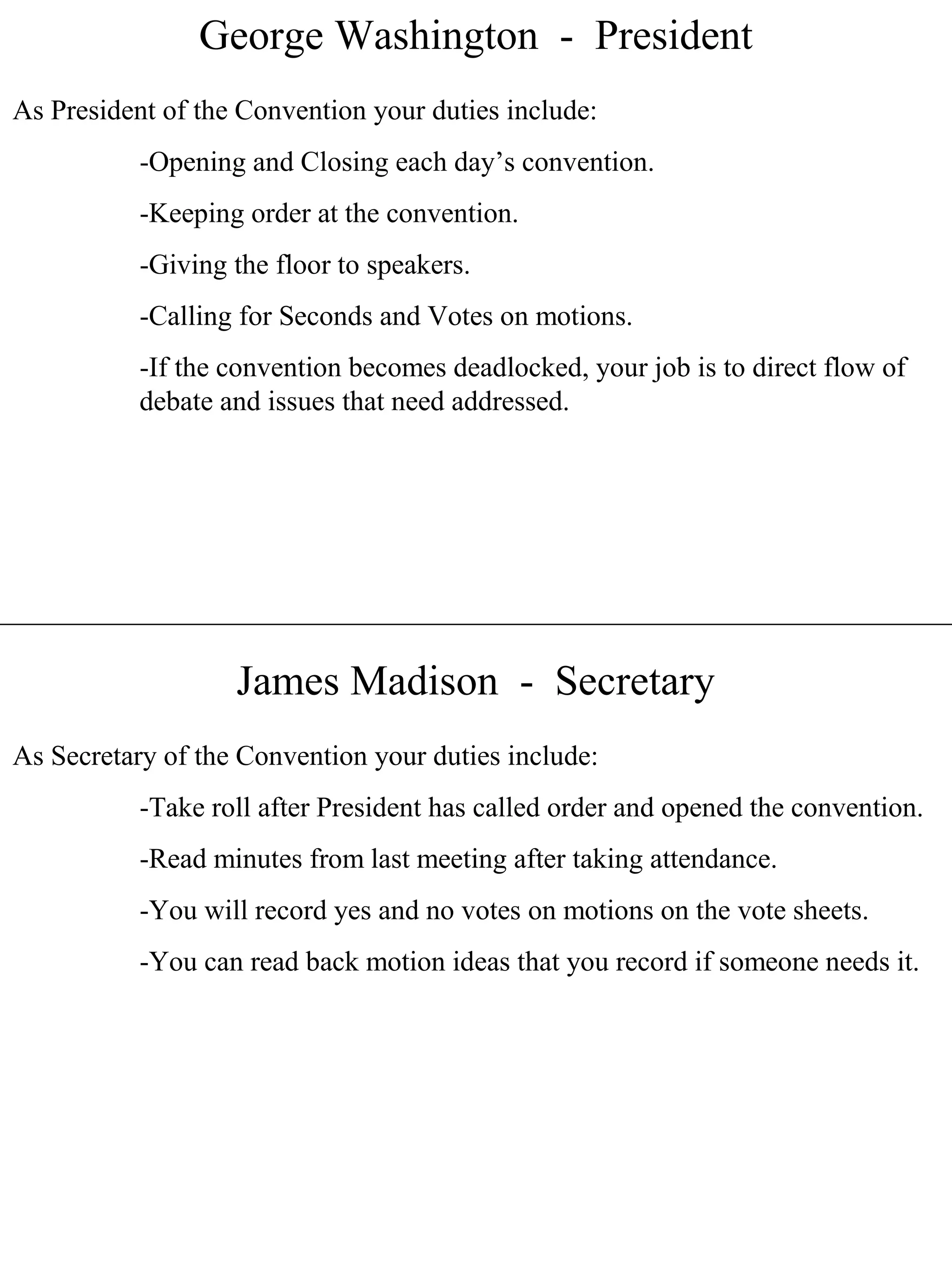 George Washington will serve as President of the Convention to keep order and direct debate. James Madison will serve as Secretary to take notes. Their duties are outlined. Delegates are assigned roles that represent different states and positions on issues like federal power and slavery. The document outlines beliefs held by each delegate that will guide their participation in the debates.