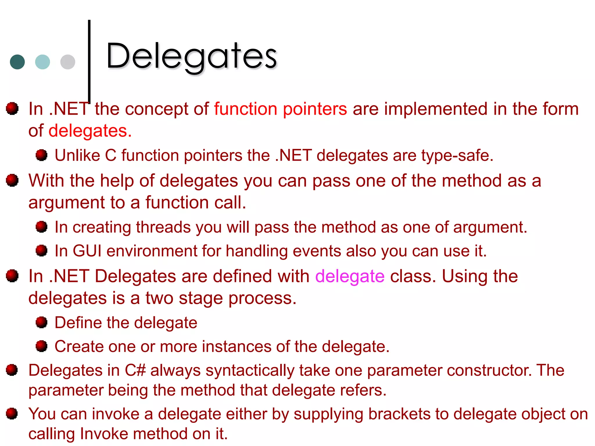 This document discusses delegates, events, and generic delegates in .NET. It defines delegates as type-safe function pointers that allow methods to be passed as arguments. Delegates are defined using the delegate keyword and can refer to static or instance methods. Events are based on the delegate model and allow classes to notify other classes of occurrences. The EventHandler delegate is commonly used for events without custom data, while EventHandler<TEventArgs> passes custom data. Generic delegates make the parameter type variable, allowing flexibility.