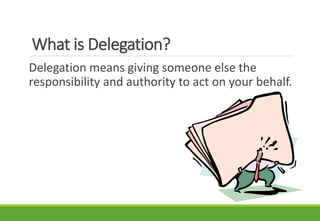 The document explains the concept of delegation, which involves assigning responsibility and authority to others to act on one's behalf. It highlights the differences between delegation and job assignments, the reasons why individuals may resist delegating tasks, and the benefits of effective delegation. Additionally, it outlines a structured process for delegation, including setting objectives, selecting tasks and individuals, and reviewing results.