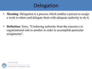 The document discusses the concept and principles of delegation in an organizational context, outlining the process of assigning duties, delegating authority, and ensuring accountability. It categorizes delegation into various types, such as general, specific, written, unwritten, formal, and informal, and highlights the advantages and potential problems associated with delegation. Steps for successful delegation are also provided, emphasizing goal establishment, supervision, and training.