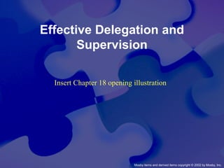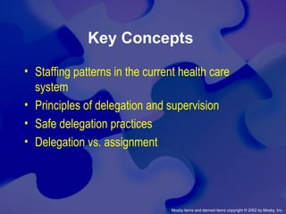 This document discusses effective delegation and supervision in healthcare. It covers key topics like staffing patterns, principles of delegation, safe delegation practices, and the differences between delegation and assignment. Delegation is described as transferring responsibility and authority for tasks while maintaining accountability. For delegation to be done safely, the RN must consider factors like the patient's condition, delegatee's competencies, task complexity, policies and standards of care. Proper supervision is also emphasized as crucial for delegation.