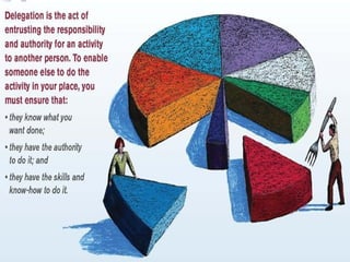 This document discusses the concept of delegation. It defines delegation as sharing or transferring authority and responsibility from a superior to a subordinate. The document outlines reasons for delegating such as using existing skills and developing new leaders. It also discusses potential barriers to delegation for both managers and subordinates. Finally, the document provides steps and best practices for effective delegation, including introducing tasks, demonstrating expectations, and supporting delegates.