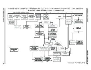 This document contains 14 sections with process flowcharts related to general and specific court procedures involving mediation and judicial dispute resolution. The flowcharts outline the steps for civil and criminal cases that qualify for mediation or other alternative dispute resolution methods. Key parts of the process include case screening to determine eligibility, scheduling mediation proceedings, selection of mediators, and documentation of outcomes like settlements or requiring further court action.